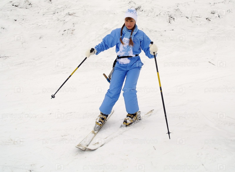 Девушка в голубом комбинезоне катается на горных лыжах. Город Домодедово, Московская область