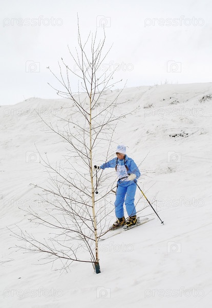 Девушка в голубом комбинезоне катается на горных лыжах. Город Домодедово, Московская область