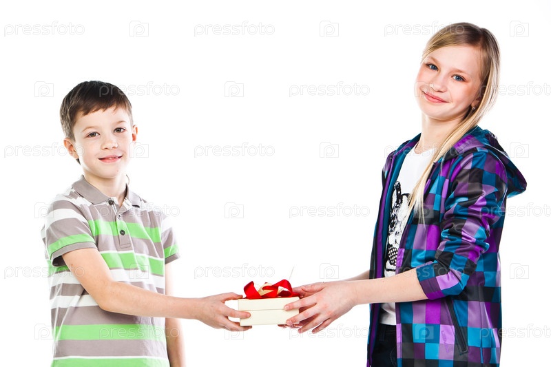 Мальчик дарит красивой девочке подарок