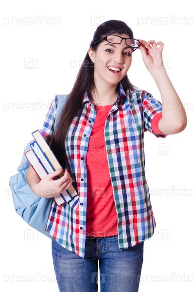 Молодой студент с книгами на белом фоне