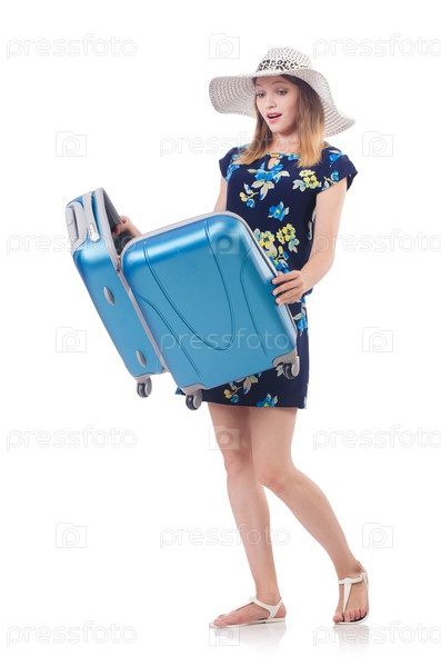 Женщина с чемоданами, изолированная на белом фоне