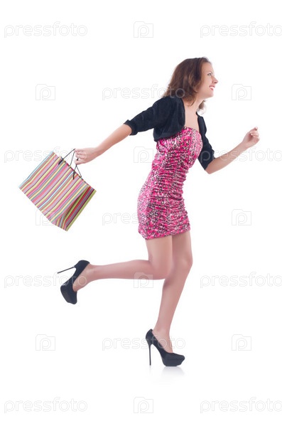 Девушка после удачного похода по магазином на белом фоне