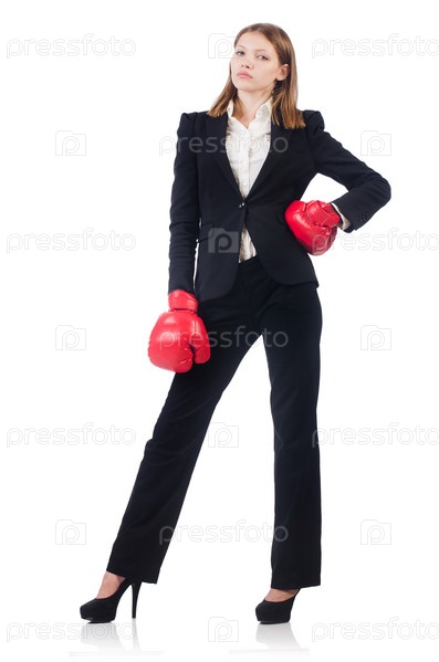 Бизнес-леди с боксерскими перчатками на белом фоне