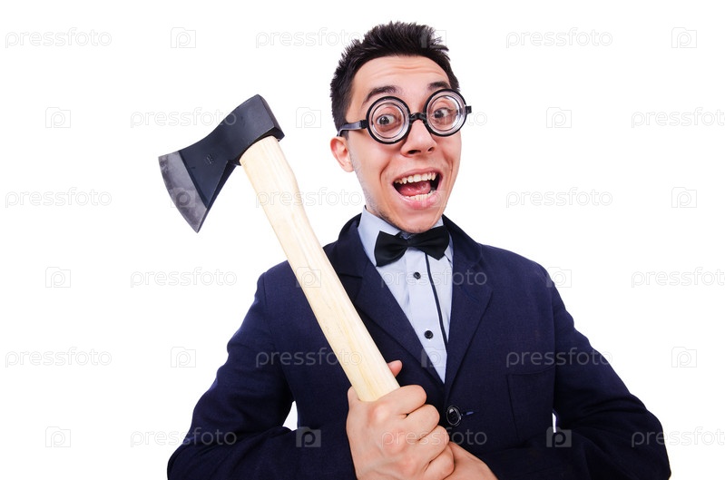 Забавный мужчина с топором на белом фоне