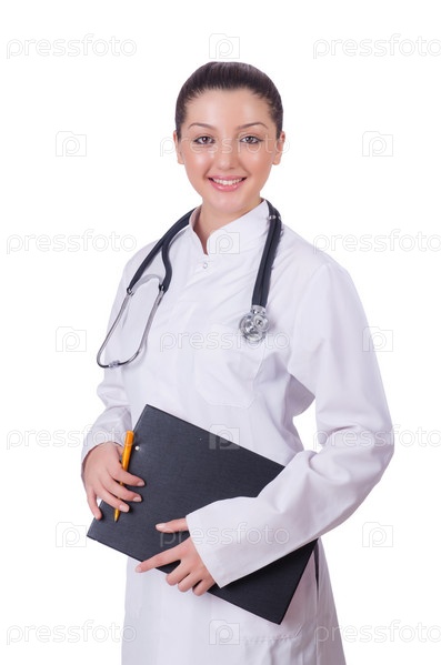 Молодая женщина-врач на белом фоне