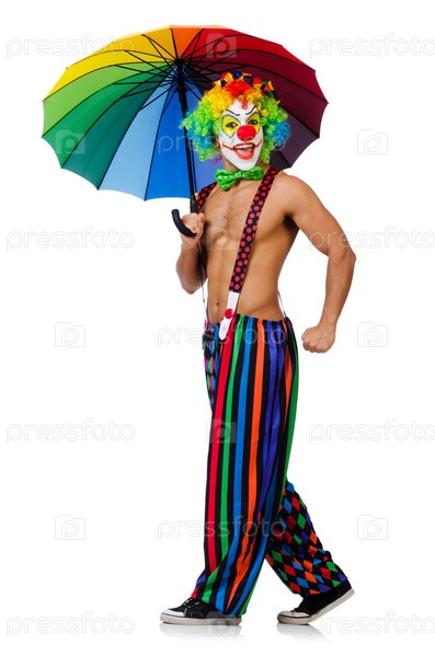 Клоун с зонтиком, изолированный на белом фоне
