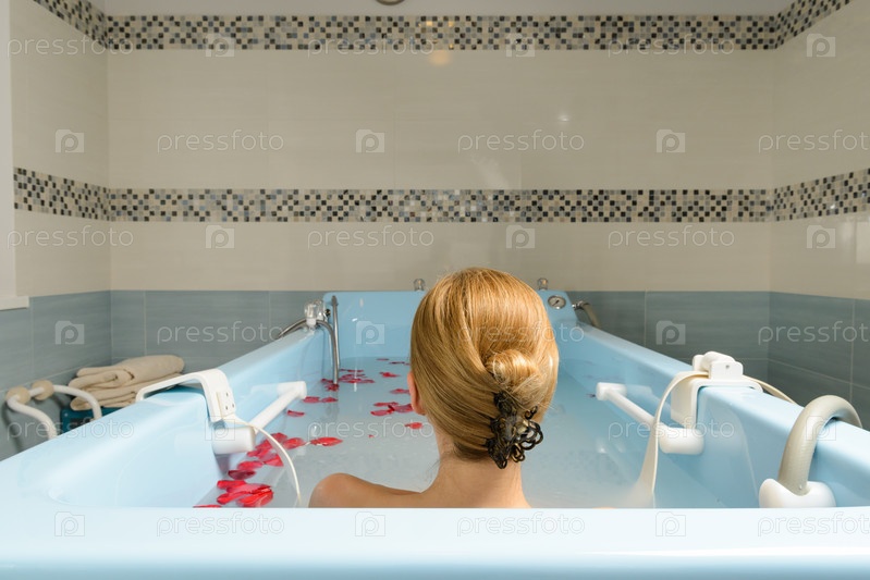 Молодая женщина принимает ванну с молоком и лепестками роз