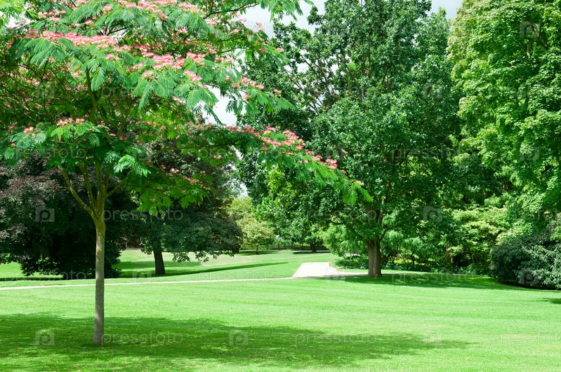 Летний парк с красивыми зелеными газонами