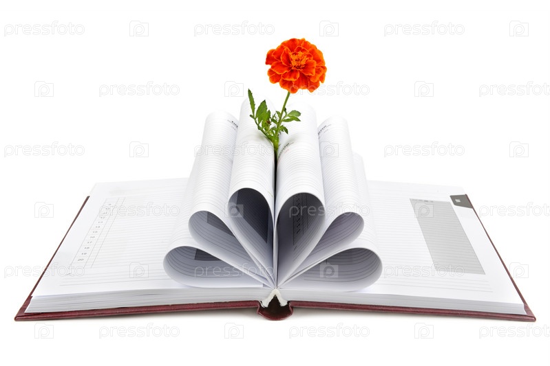 Книга и цветок, изолированные на белом фоне
