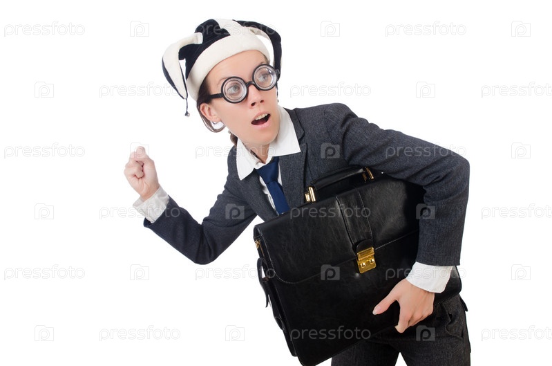 Бизнес-леди в клоунском колпаке, изолированная на белом фоне