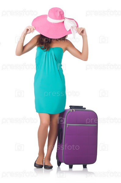 Девушка с чемоданами, изолированная на белом фоне