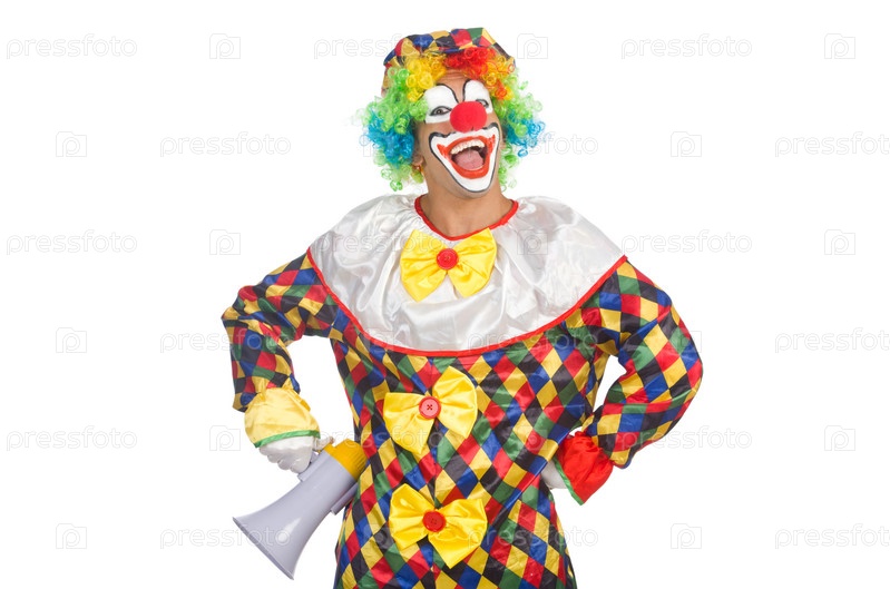 Клоун с громкоговорителем на белом фоне