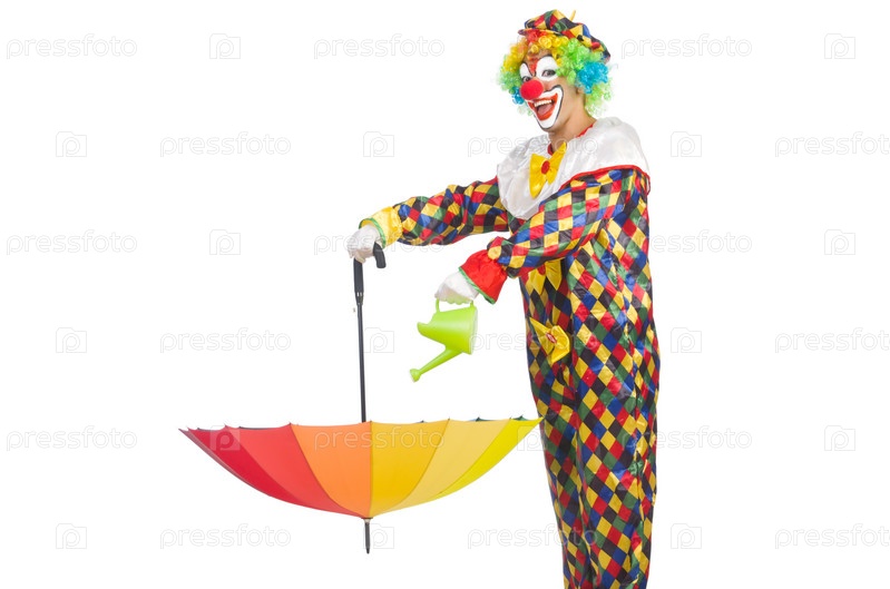 Клоун с зонтиком на белом фоне