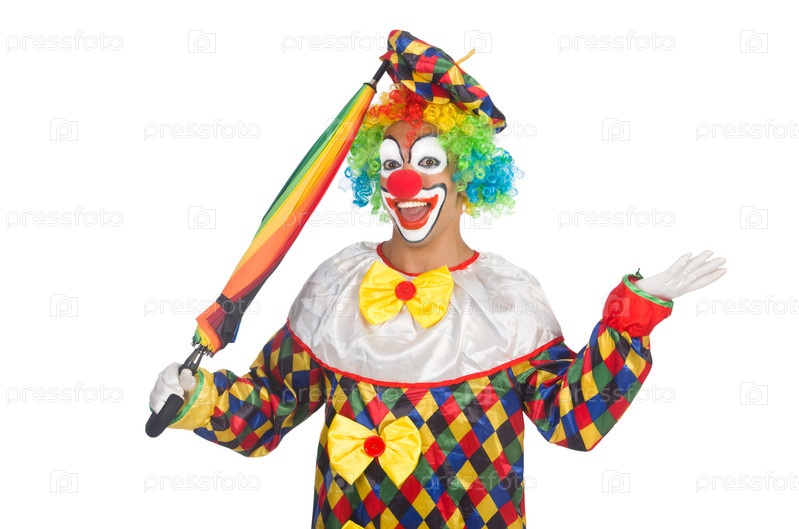 Клоун с зонтиком на белом фоне