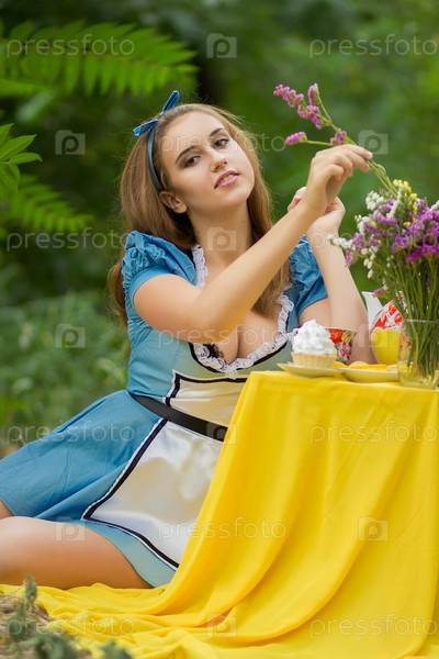 Портрет красивой русой девушки в образе Алисы в стране чудес