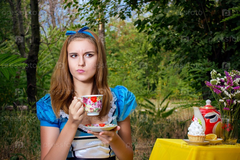 Портрет красивой русой девушки в образе Алисы в стране чудес