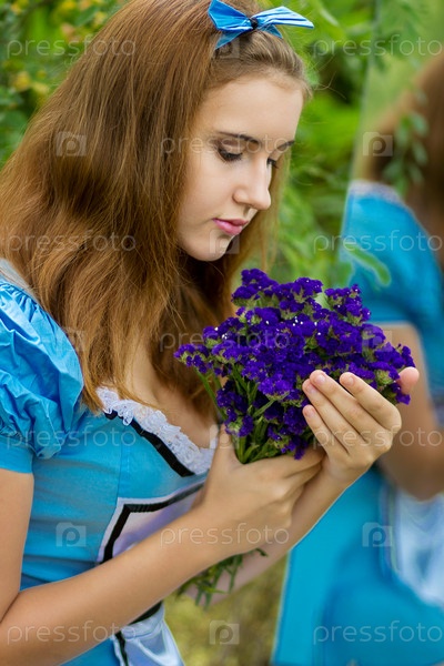 Портрет красивой русой девушки в образе Алисы в стране чудес
