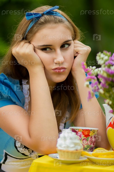 Портрет красивой русой девушки в образе Алисы в стране чудес