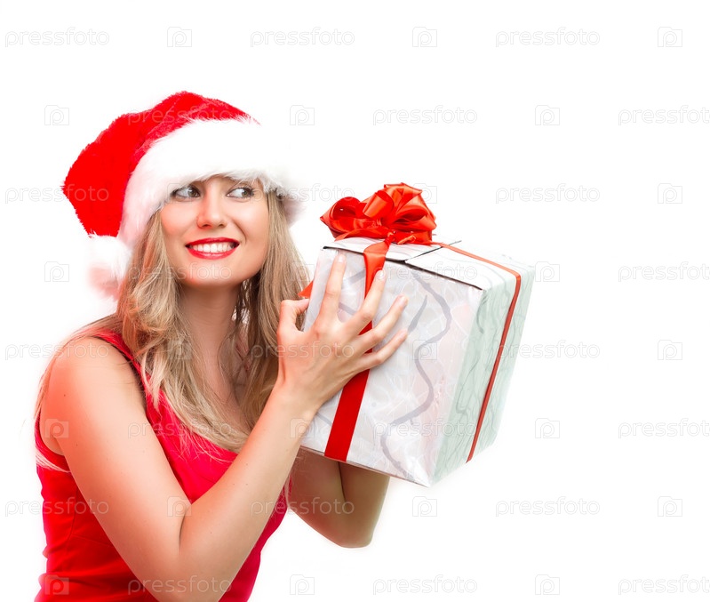 Молодая улыбающаяся женщина держит рождественские подарки