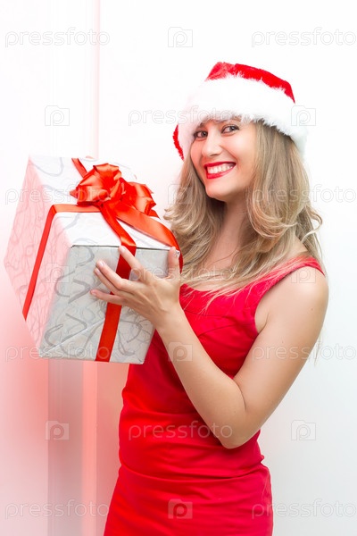 Молодая улыбающаяся женщина держит рождественские подарки