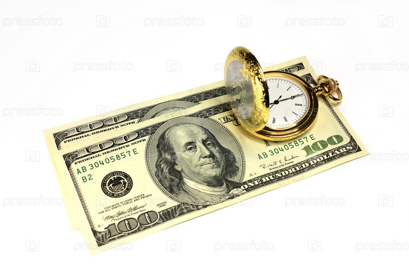 Часы и стодолларовая купюра как символ финансовой деятельности