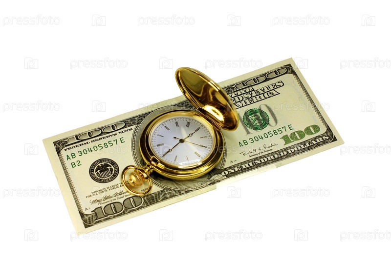 Часы и стодолларовая купюра как символ финансовой деятельности