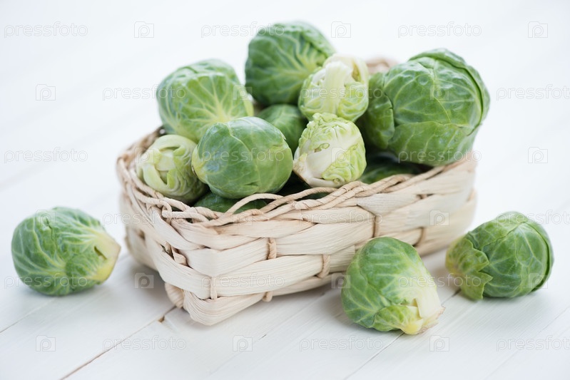 Брюссельская капуста в плетеной корзинке крупным планом