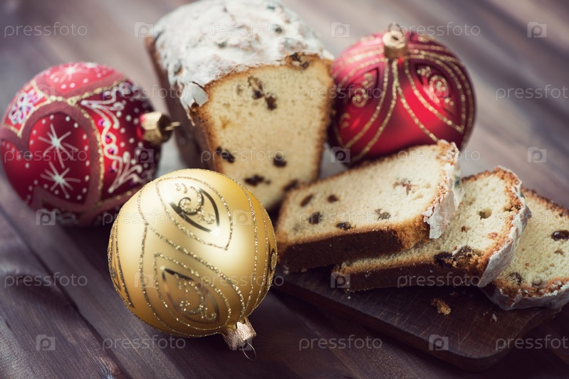 Нарезанный рождественский кекс и елочные игрушки