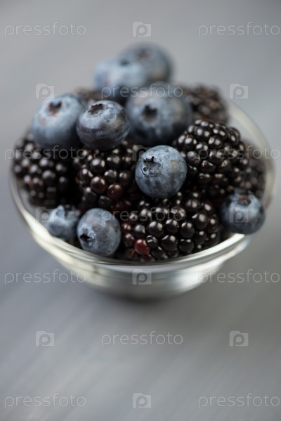 Стеклянная чаша, полная спелой ежевики и голубики, крупным планом
