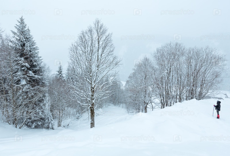 Женщина на прогулке в зимних горах в туман