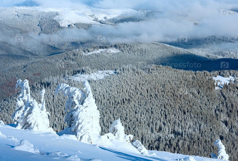 Зимний горный пейзаж с заснеженными деревьями