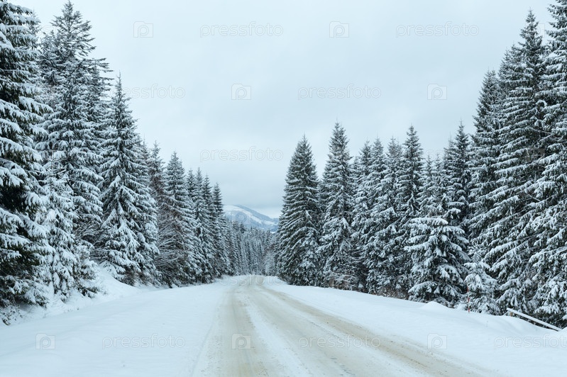 Зимняя дорога в еловом лесу в пасмурный день
