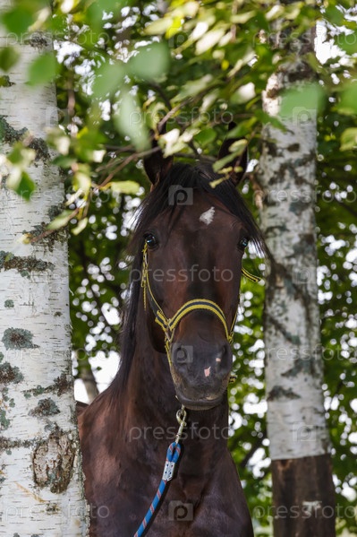 Красивый жеребец в березовом лесу