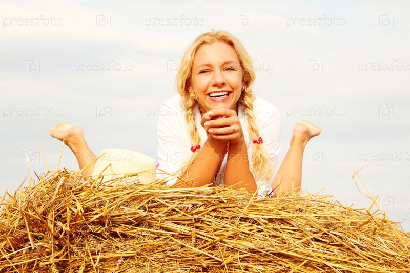 Красивая женщина на стоге сена
