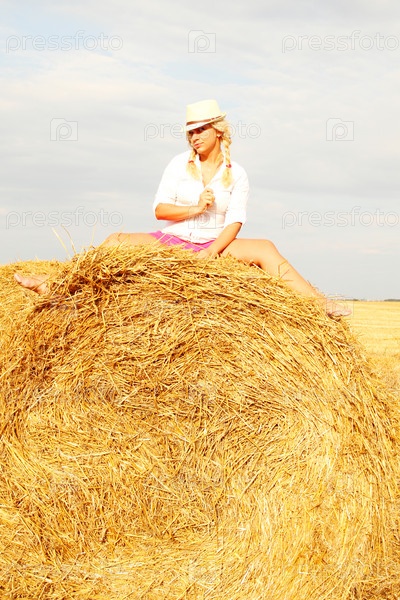 Красивая женщина на стоге сена