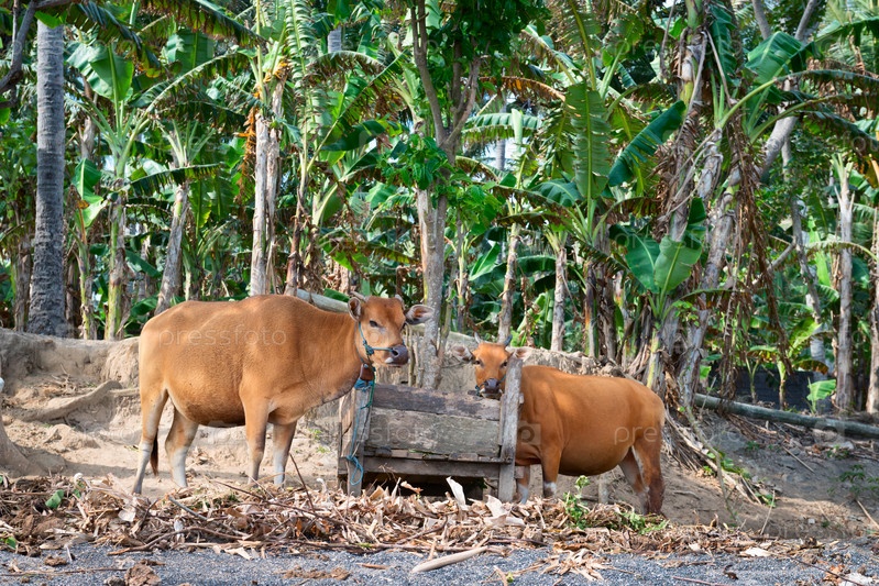Желтые коровы возле деревянного корыта
