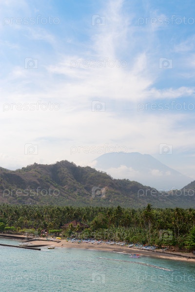 Тропический пляж с вулканом на заднем плане