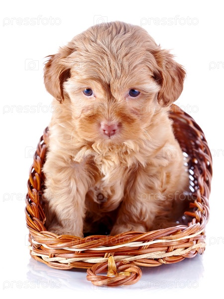 Щенок декоративной породы в плетеной корзине