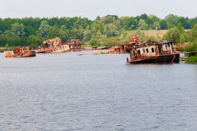 Затонувший заброшенный корабль на реке