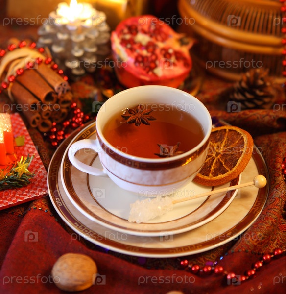 Рождественский натюрморт с чашкой чая