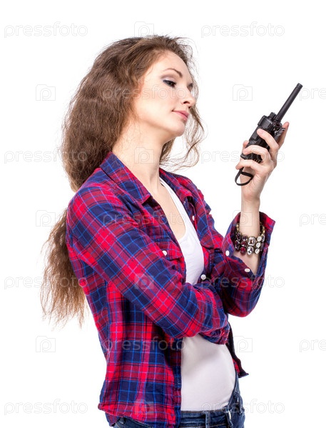 Привлекательная молодая женщина в клетчатой рубашке с рацией