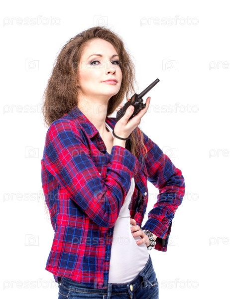 Привлекательная молодая женщина в клетчатой рубашке с рацией
