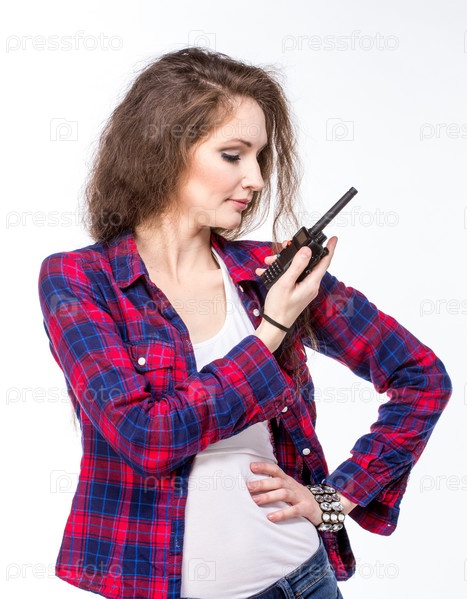 Привлекательная молодая женщина в клетчатой рубашке с рацией