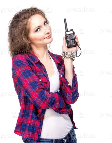 Привлекательная молодая женщина в клетчатой рубашке с рацией