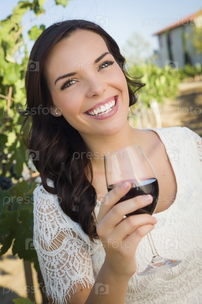 Молодая женщина наслаждается бокалом вина на винограднике