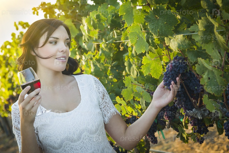 Молодая женщина наслаждается прогулкой и вином на винограднике