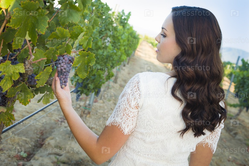Молодая женщина наслаждается прогулкой и вином на винограднике