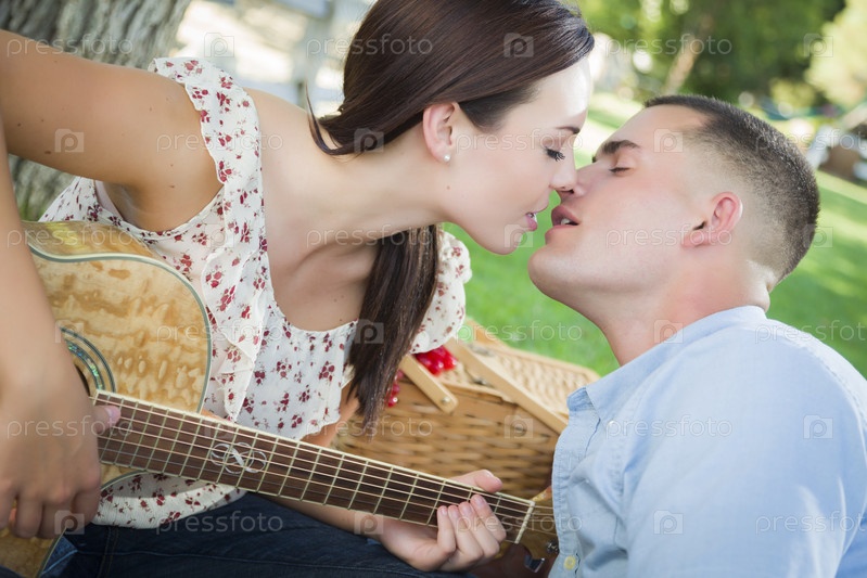 Пара с гитарой целуется в парке