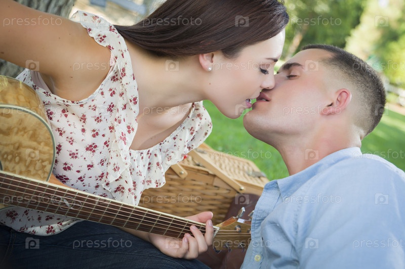 Пара с гитарой целуется в парке