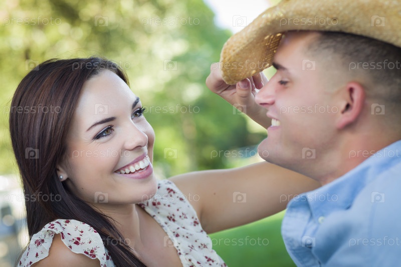 Романтическая пара с ковбойской шляпой флиртует в парке